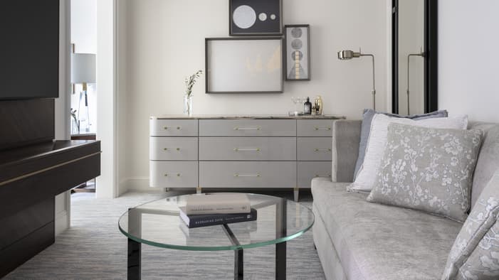 Botanical prints, robin’s egg wall covering and corridor flooring reminiscent of the ocean’s waves compliment refined materials like brass and lacquered woods to create a relaxing, soothing and restful experience.