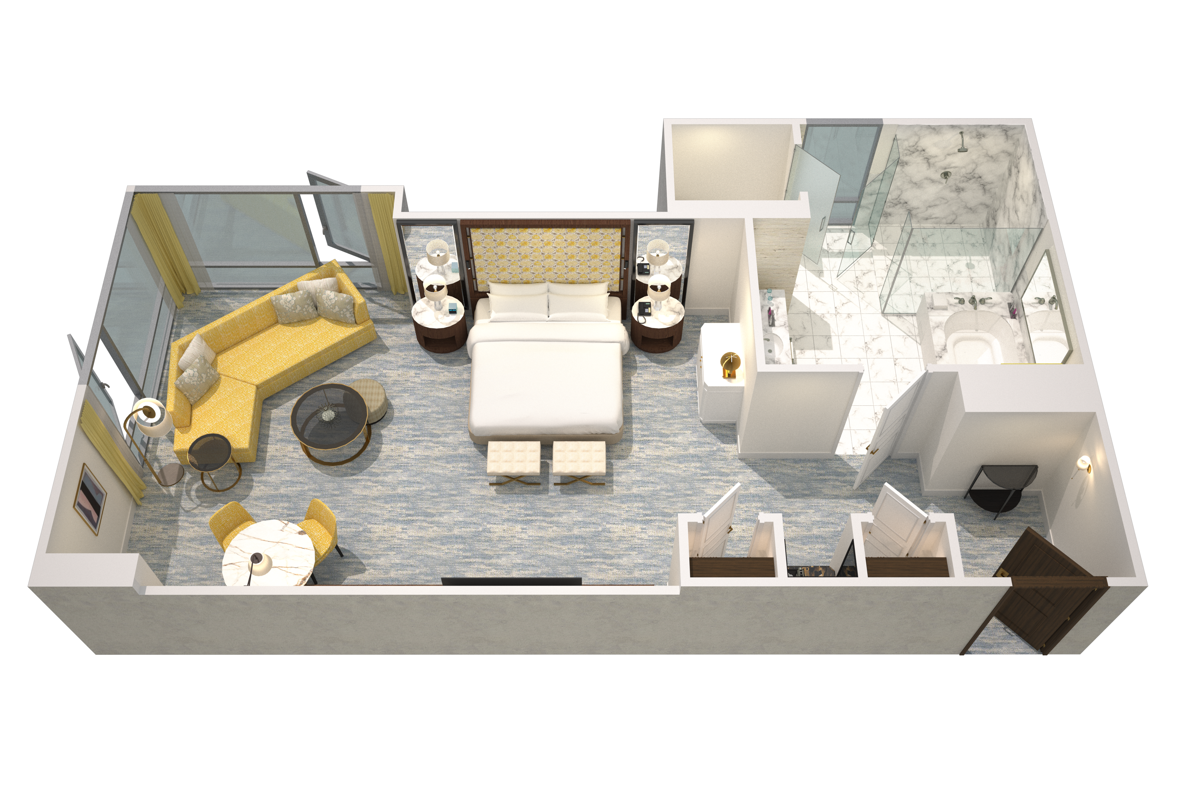 Natural light fills every corner of this open-air suite, while a calming coastal colour scheme sets a relaxing tone.