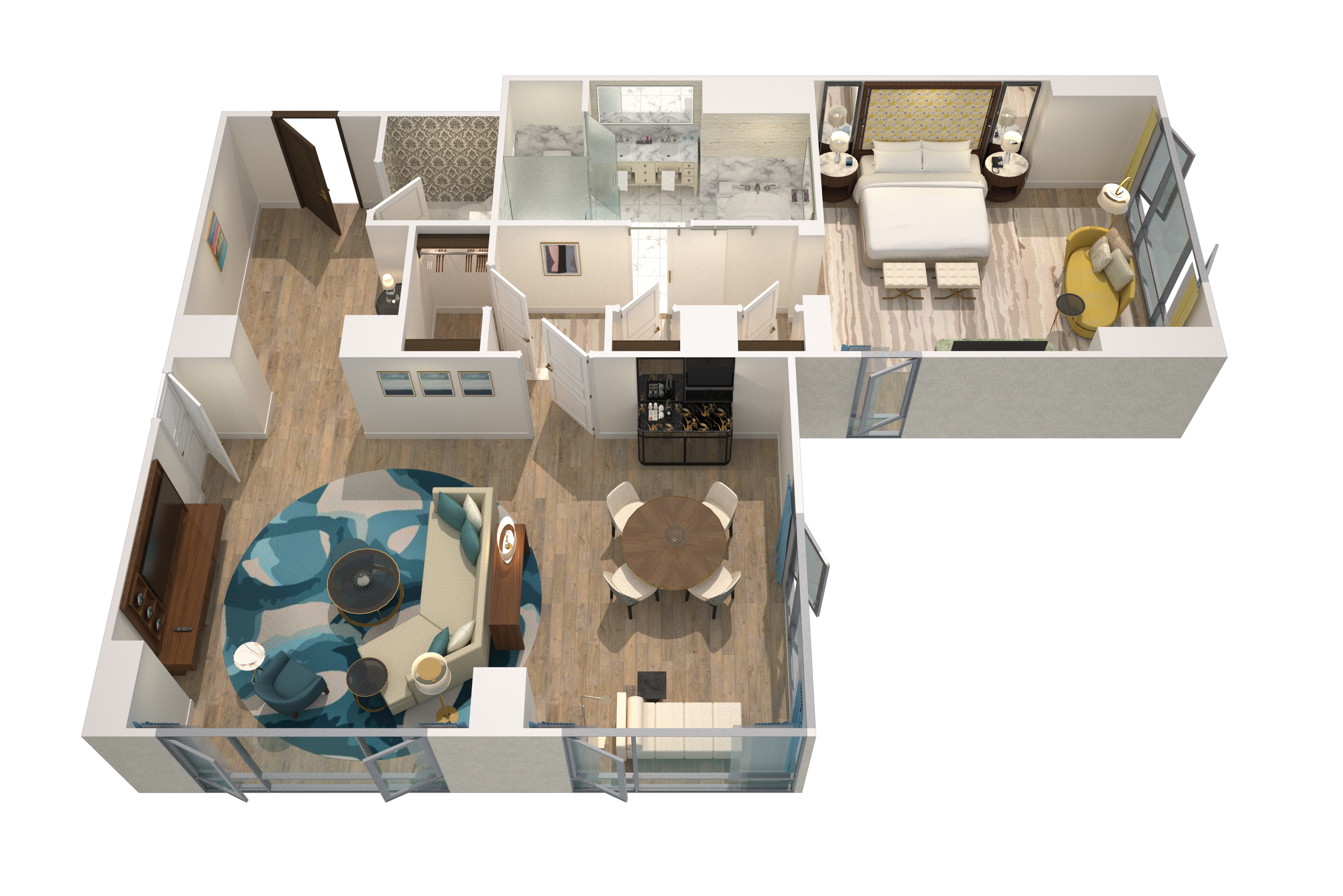 The California sun warms every aspect of this family-friendly suite, while floor-to-ceiling windows feature views of a pristine waterfall and the Santa Monica Mountains.