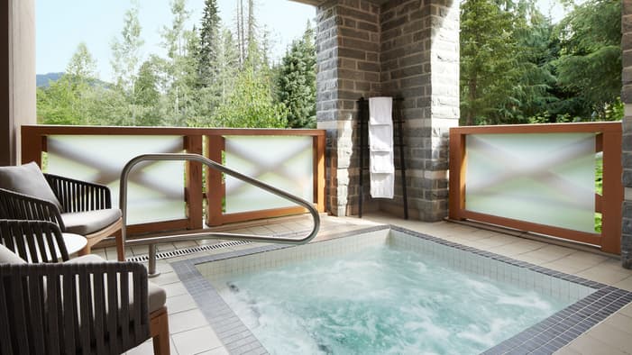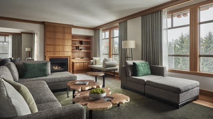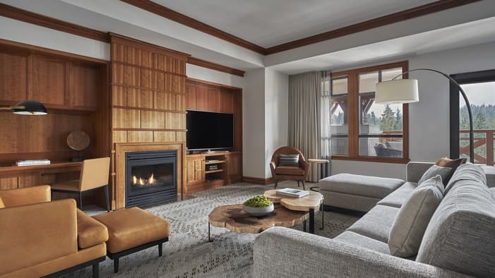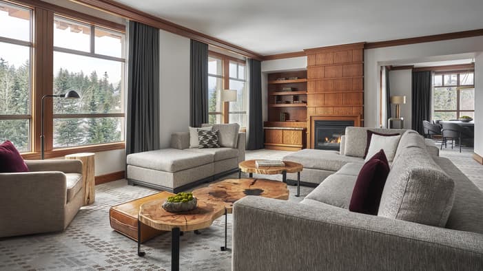 The largest hotel rooms in Whistler feature sophisticated wooden interiors and come with a gas fireplace, separate sitting area and privileged views out across either snow-capped mountains or courtyard and forest.