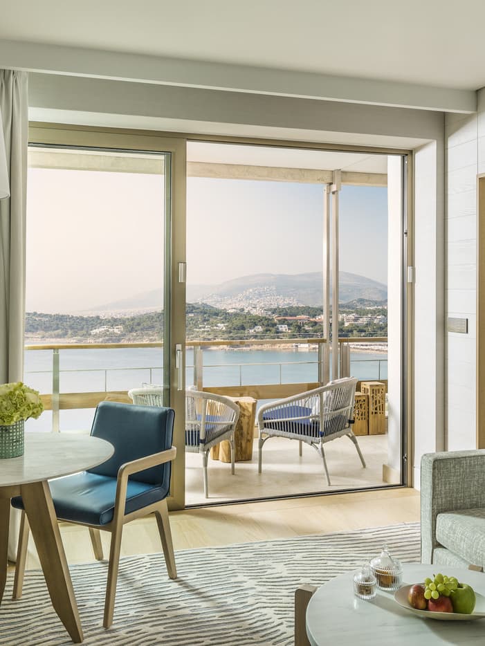 蔚蓝的海景令这一别具巧思的单卧室套房增色不少。舒适的沙发、办公用餐皆宜的大理石桌,以及沐浴在希腊灿烂阳光下的私人阳台,一切都让您倍感宾至如归。