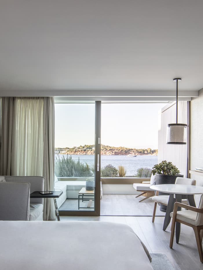 超大落地窗将金色的希腊阳光优雅引入室内。宽大的阳台配有舒适的家具,供您一边舒展身心,一边欣赏海天一色的美景。