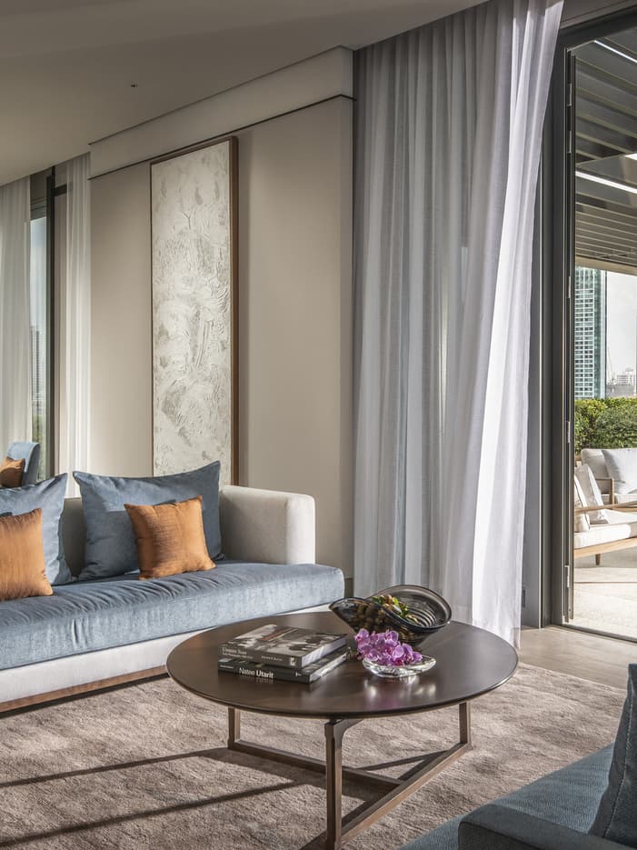 开阔的室内外空间为您在曼谷的居停带来全新可能。您可以在私人屋顶露台上,与朋友小酌几杯,同时将湄南河景尽收眼底。或者,在结束一天行程后,于宽敞的起居室中与家人一起放松,同时饱览曼谷的繁华市景。