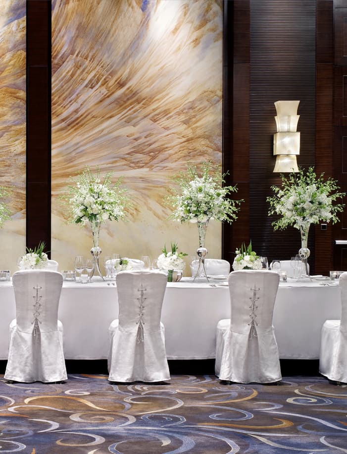 精美绝伦的大宴会厅为无柱设计,融合现代与传统风格,自然天成的色调,奢华优雅的水晶吊灯,高达6.8米的金色调天花板,处处彰显出雍容华贵的气派。大宴厅可以分隔成3个独立空间,同时配有宽敞的迎宾区,可根据您的风格喜好与需求进行装饰与布置。