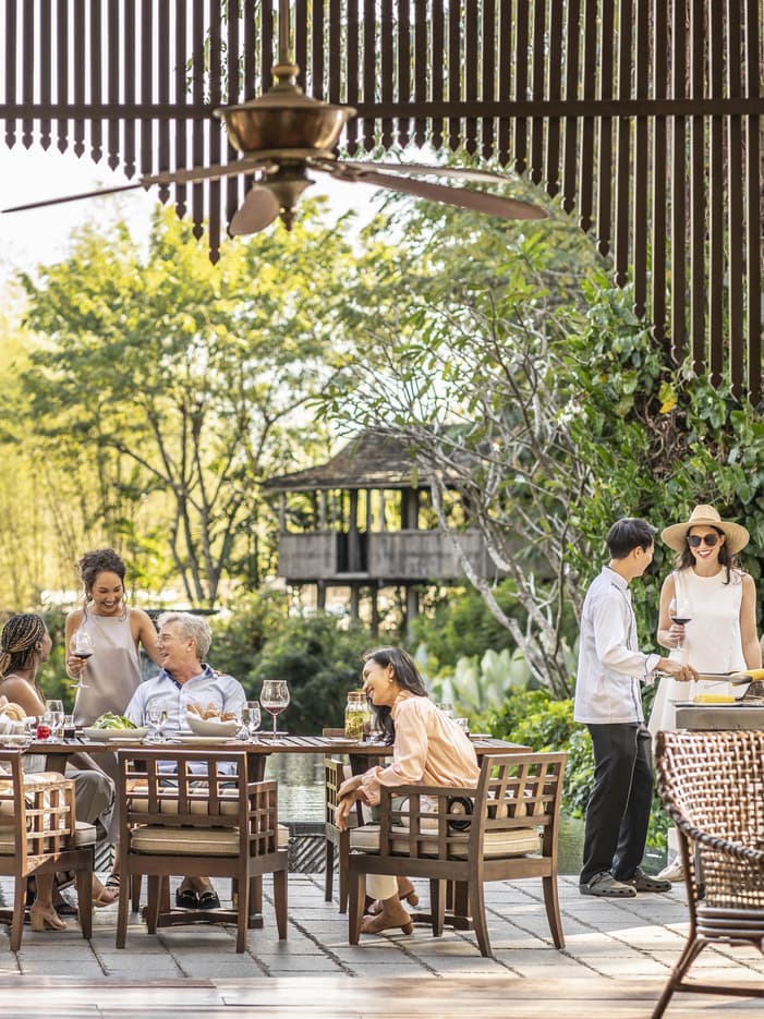 团体主题晚餐 — 纯正泰味在稻田旁的鸡尾酒会草坪上,奢享星空下的美餐。先在日落时分啜饮鸡尾酒,然后落座草坪,享用精致晚餐。期间不仅有现场音乐助兴,还有传统泰国舞者在放水灯时表演火焰舞。我们可根据要求安排“水灯之夜”主题晚餐,现场从迎宾区到泳池平台都将布置华丽的鲜花和蜡烛。