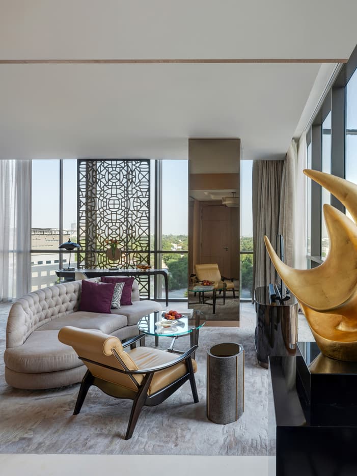 现代风格的石灰岩浴室与别致雅丽的卧室由通透的玻璃墙隔开,令工作室套房的整体空间倍显敞亮明朗。一天的日程开始之前,或是忙碌的工作结束之余,不妨在此放松休憩,舒享安宁。客房为开放式布局,墙面以木板镶嵌,配有手工簇绒地毯和定制的阿拉伯风格金属花窗,窗外迪拜国际金融中心美景跃入眼帘。