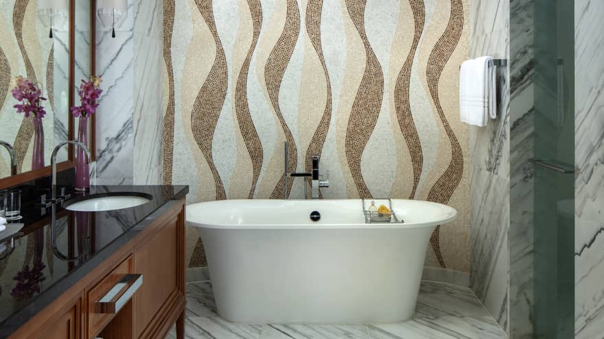 水疗式浴室踏入华美迷人的浴室,映入眼帘的是独立式浸泡浴缸、雨林淋浴间、大理石地面和嵌入式镜面电视。