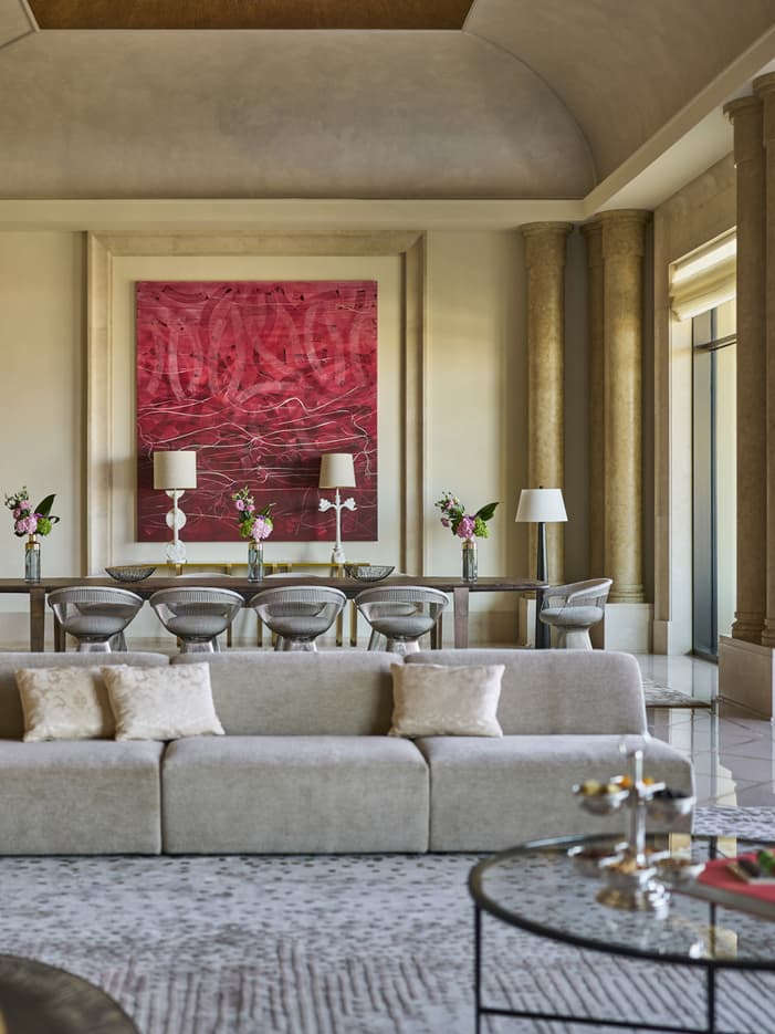 乘私人电梯进入我们位于顶层的皇家套房,一派富丽堂皇的景象映入眼帘。套房明亮、通透,大理石地板、高耸的柱子以及充沛的自然光,与书房和多媒体室中的木质板材装饰和温馨家具相互辉映,进一步烘托出套房的雅致格调。