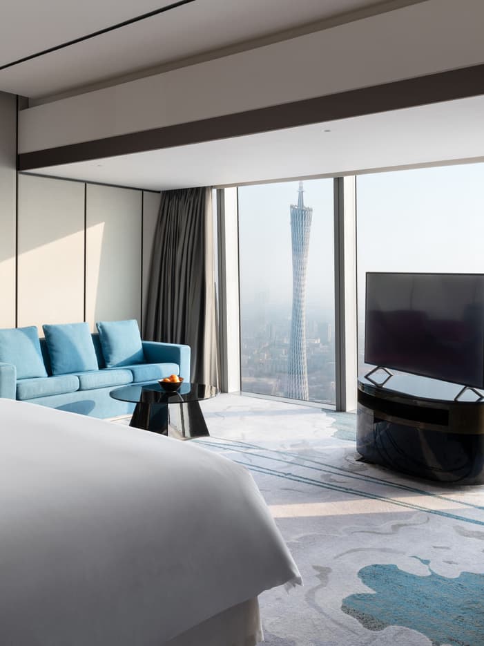 广州四季酒店的尊贵广州塔塔景客房位于 74 至 84 层,设计优雅,包含宽敞的大理石浴室、定制的特大床,还有舒适的工作空间。