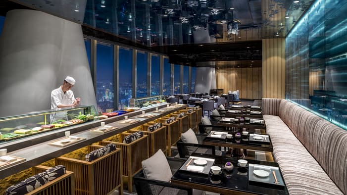 位于酒店 99 层的天吧提供精选香槟、葡萄酒、烈酒和招牌鸡尾酒。每逢周一,尊享瓶装威士忌七折优惠的同时,还能欣赏现场乐队演奏,以及城市天际线的迷人夜景。