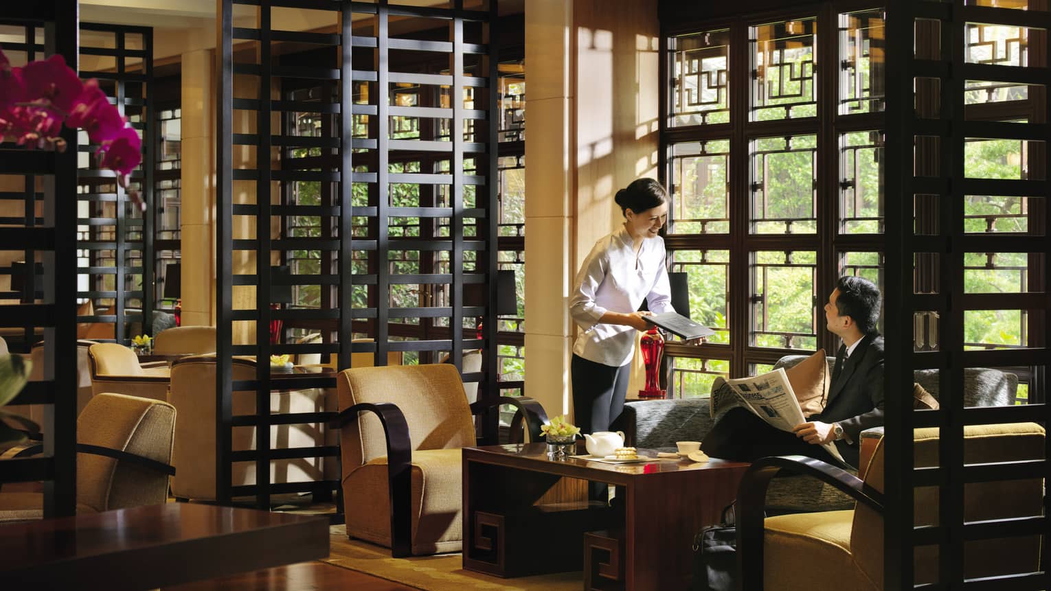 以大堂中的深色木饰与苏绣艺术品诚迎您的光临