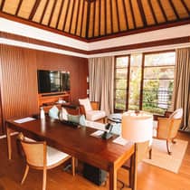 Lampit 和 Ikat 布艺、茅草屋顶、木地板等当地材料营造出一种地方感,而出自知名雕刻师 Made Jojol 之手的墙面镶板则为客房增添了一股优雅的巴厘岛气息。