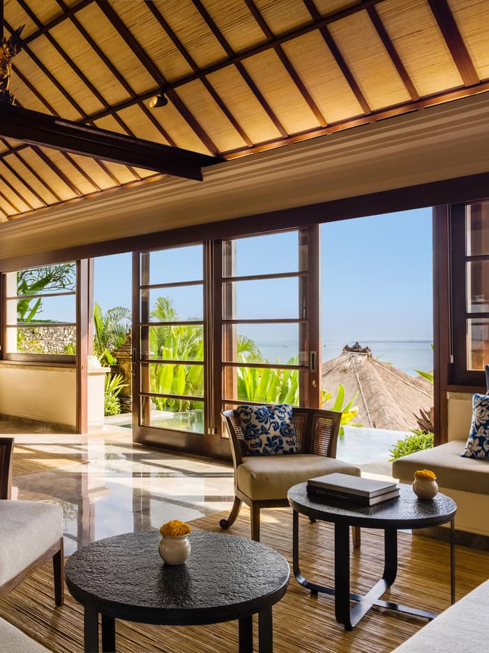 配有巴厘岛古董与雕刻品,家具上装饰着用颜色华美鲜艳的本地 Ikat 织物制作的装饰,异域的氛围充分突显了印尼的艺术之美与奢华气息