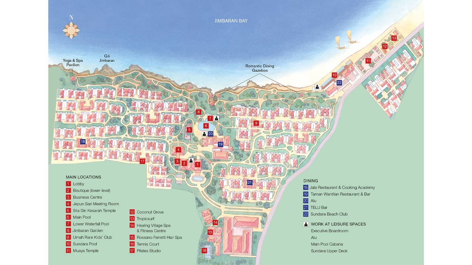 巴厘岛金巴兰湾四季度假酒店坐落于巴厘岛西南海岸金巴兰村绵延 4.8 公里(3 英里)的新月形金色沙滩旁,环境宁静幽美,距努拉莱国际机场仅 20 分钟路程,距水明漾的夜生活场所仅 45 分钟路程。