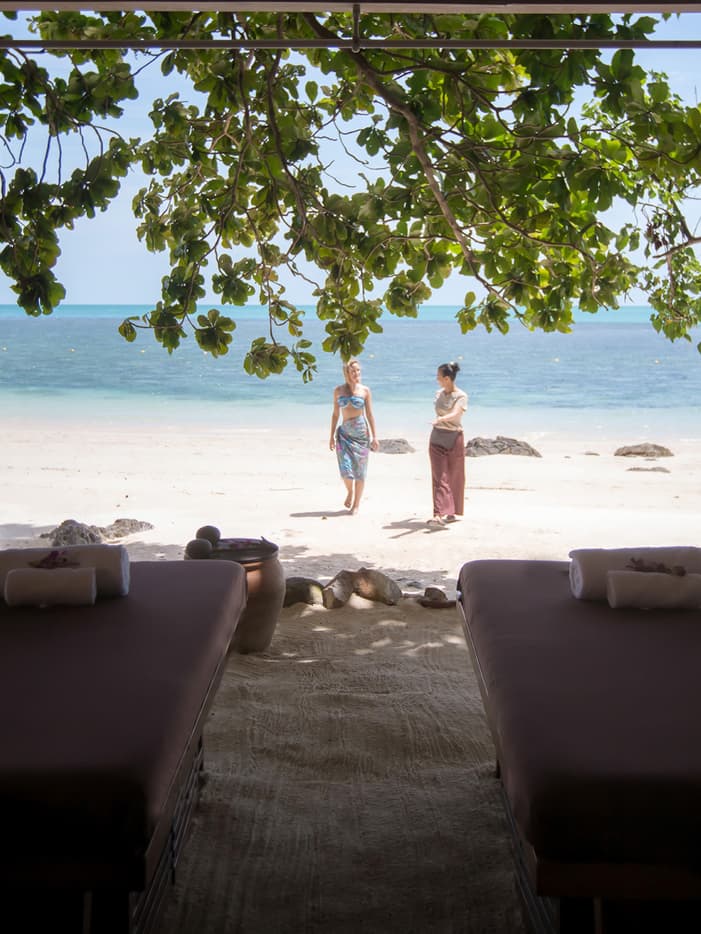 • Couples massage beds under cabana in front of two women walking on white sand beach