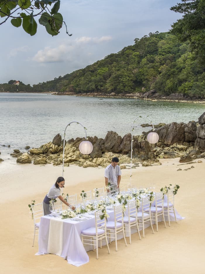 想象一下您在苏梅岛的美妙婚礼:在数百盏闪烁的灯光和满天繁星的映衬下,走过婚礼走道,与 60 位亲朋好友在我们的私人海滩上欢庆您的大喜之日。或者,选择一场只属于您和您爱人的私密仪式,然后在烛光下共享浪漫晚餐。我们的每个场地都独具苏梅岛特色,让您的特别之日在这样特别的环境布置下更显永世难忘。