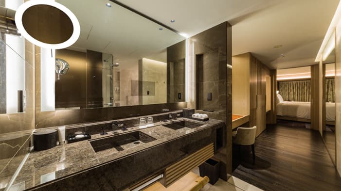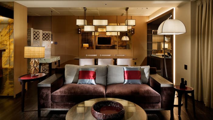 位于四层的特色套房是京都面积最大的酒店套房。您可以在起居用餐室款待来客或尽情放松,或者让我们的专职团队在您的私人备餐区为您调配鸡尾酒。