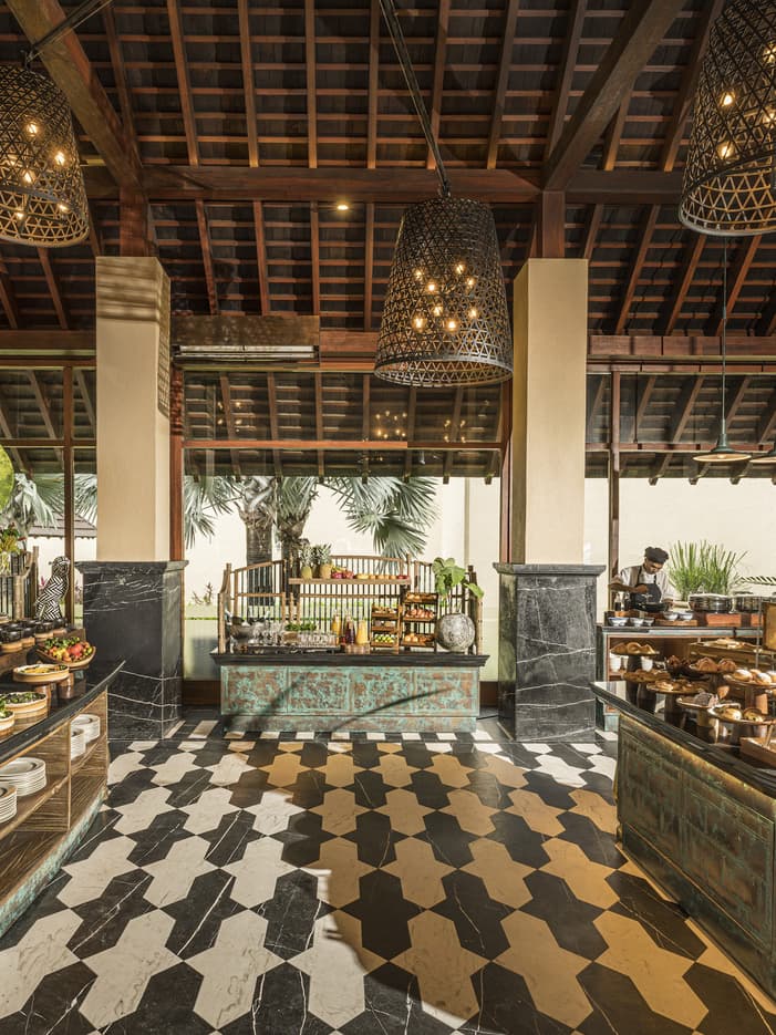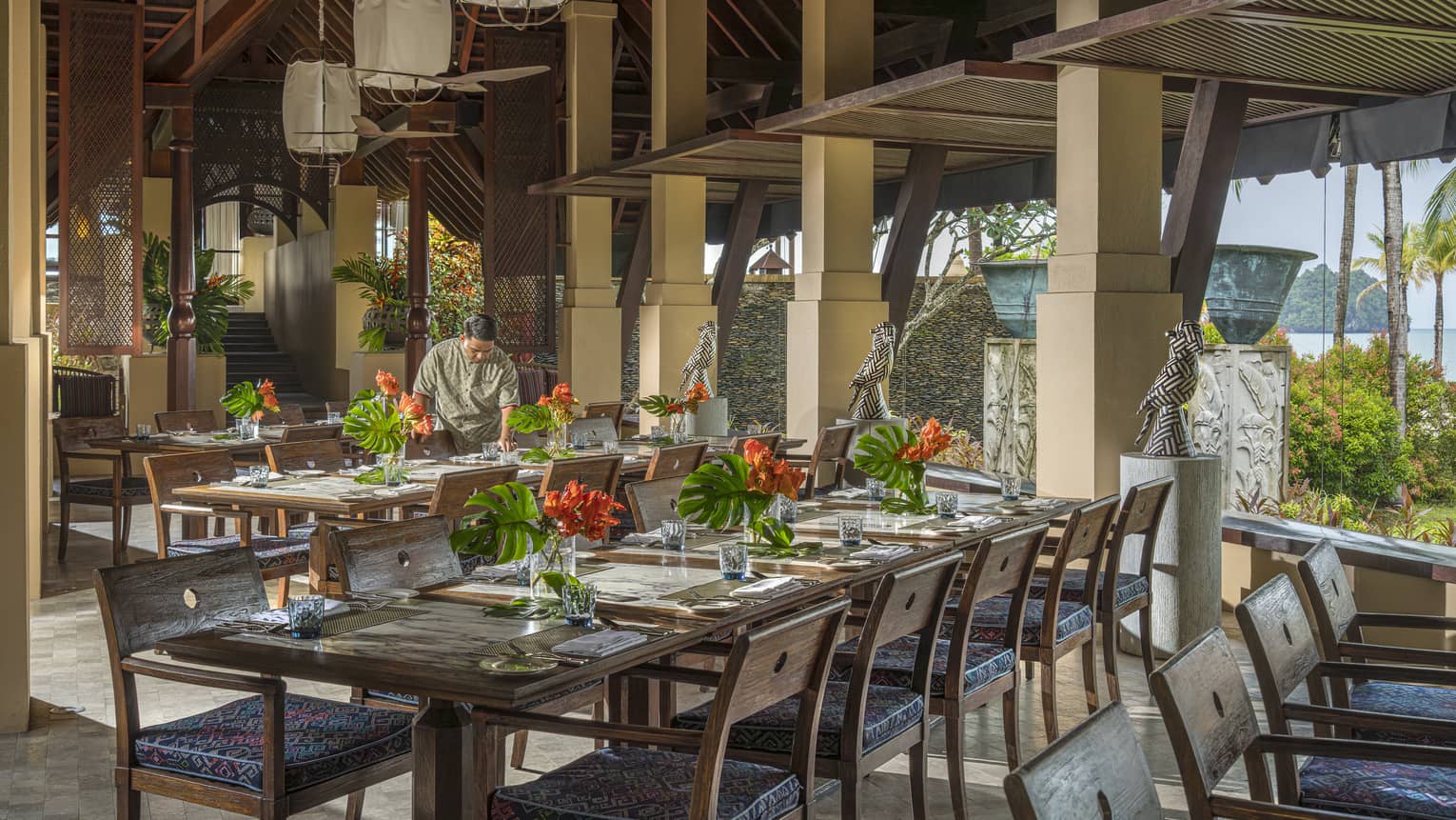室外在摇曳的棕榈树下享受惬意的露天用餐时光,赏安达曼海的壮丽全景,听海浪的轻柔呢喃。