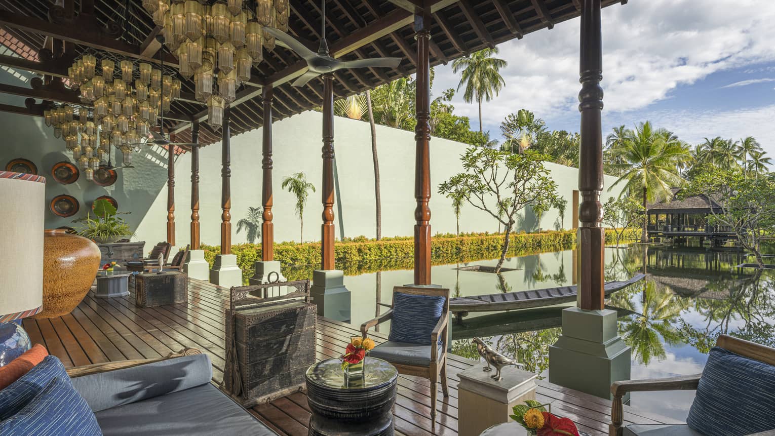 海滩别墅(带冷水池)的深蓝色调营造出宁静的氛围,精心挑选的工艺品和满架的名典书籍平添优雅的品味