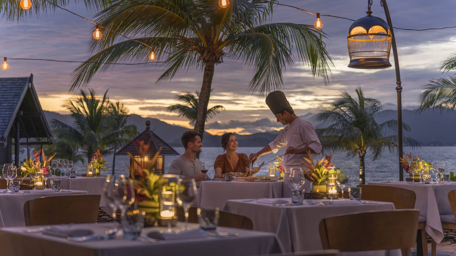 晚餐时分,在私人海滩上闲适地享用新鲜的海鲜,欢快畅聊