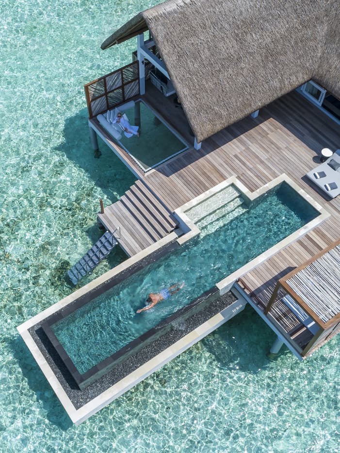 当您在水上吊床、私人泳池或观海阁楼的高处休息时,欣赏令人惊叹的日出。这些朝东的别墅拥有宽敞的卧室、起居区和通往水晶礁湖的台阶 — 新的海堤阻止海流进入海湾,全年安全游泳 — 这些朝东的别墅让您沉浸在彻底的宁静之中。