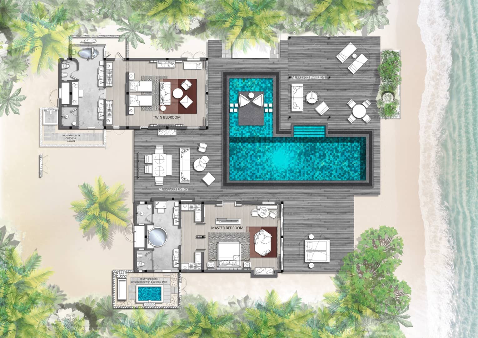 这些位于海边的海滩别墅设有两间由一条走廊连接的独立卧室、宽敞的露天起居和用餐空间,以及私人泳池,非常适合携大龄儿童出游的家庭宾客。