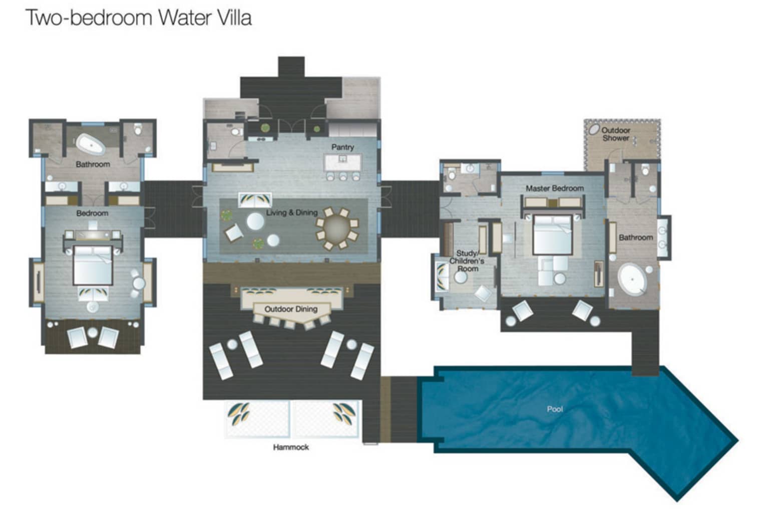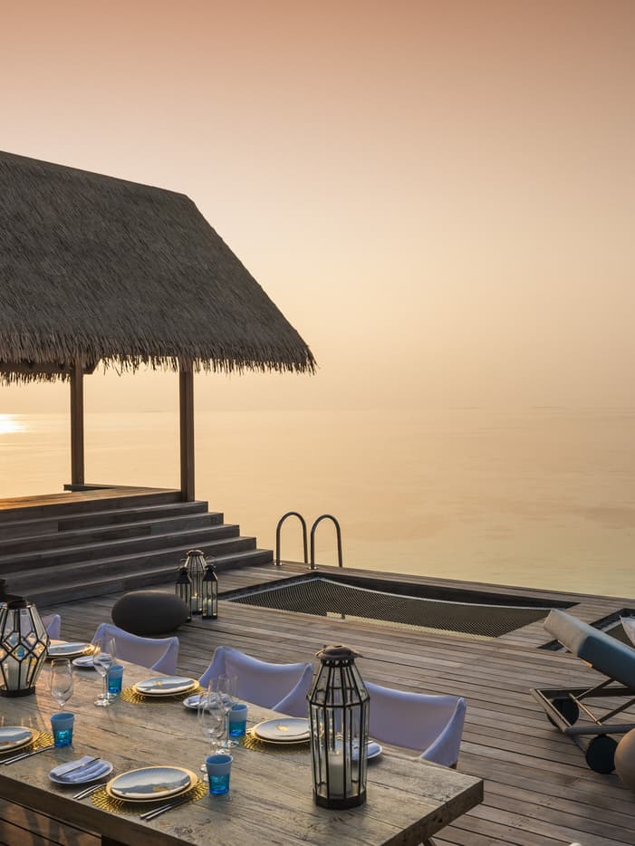 内外兼顾的奢华起居配有空调的起居室直接连通室外休闲平台,附带 17 米(56 英尺)长的日落泳池,还设有餐桌、躺椅和吊床。顺着阶梯往下走,即可到达礁岛上清澈见底的水域。