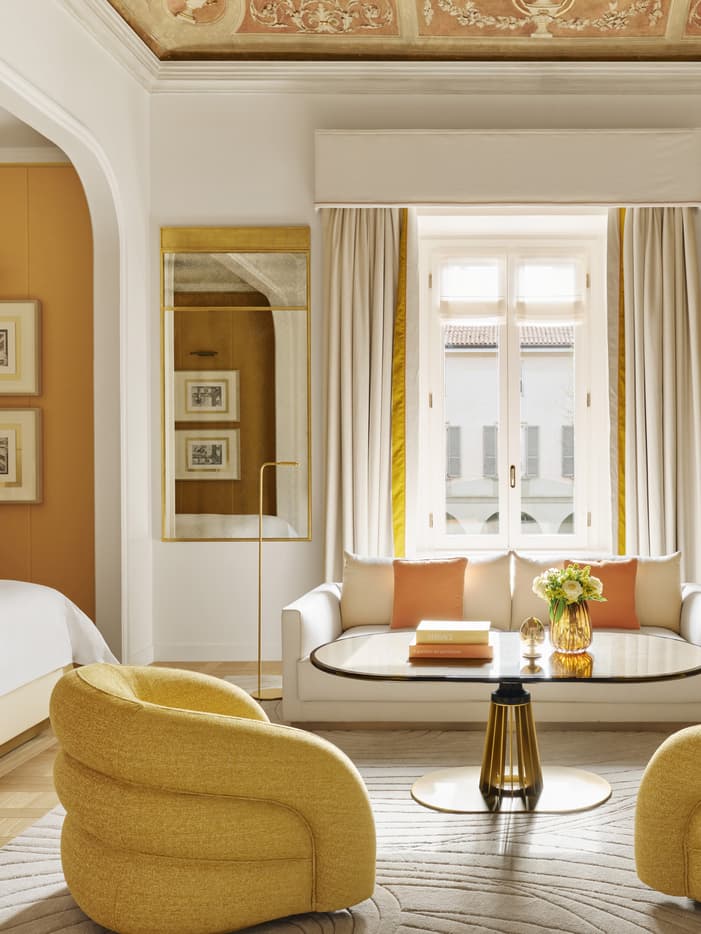 壁画套房因 Giocondo Albertolli(1742 – 1839 年)绘制的天花板壁画而独具魅力,为您提供了栖身于艺术瑰宝之中的难得体验。经室内设计师 Pierre-Yves Rochon 精心翻新后,这间套房将经久不衰的现代优雅与纯正米兰公寓的独特氛围巧妙融合,还可俯瞰酒店花园的迷人景致。两面巨大的镜子镶嵌在金色装饰镶板上,以光影魔术拓宽空间视野,黄、橙、金等暖色调的和谐运用,更营造出温暖惬意的宜居氛围。