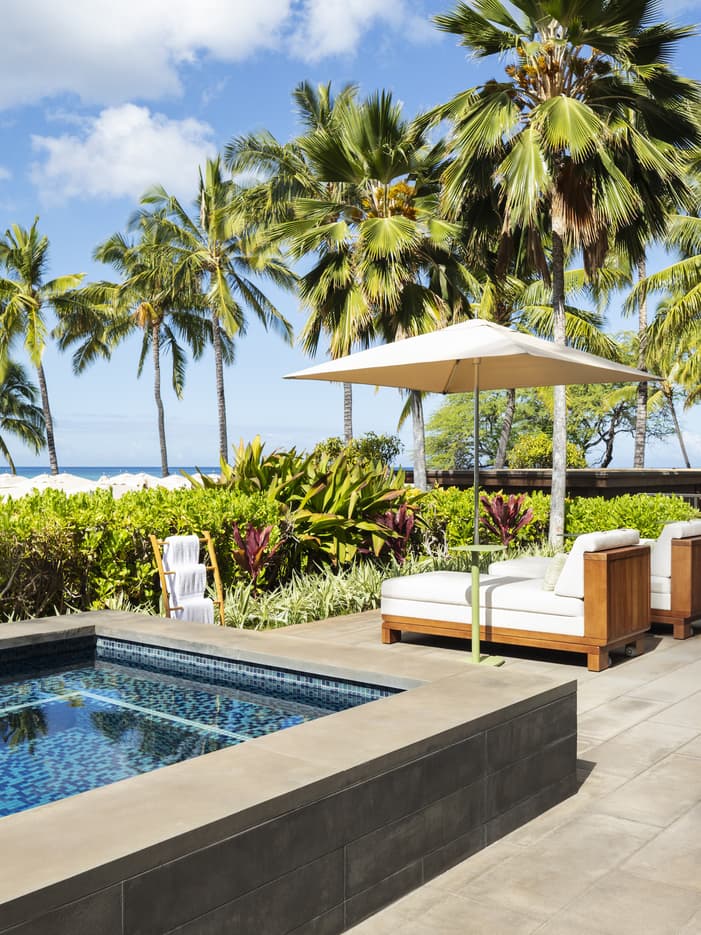香蕉叶墙面装饰和传统风格的装潢为卧室和起居区注入了一缕原汁原味的夏威夷文化风情,私人室外凉台和冷水池则为浪漫假期营造出美妙的空间。下榻此特色套房的宾客还可尊享俱乐部酒廊的专属礼遇。