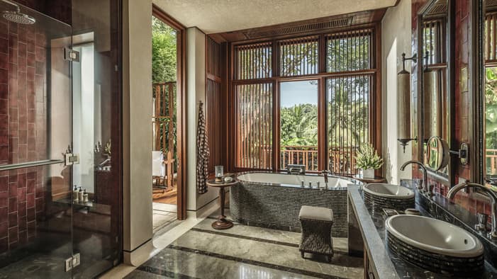 宽敞的浴室以水磨石瓷砖铺砌,配有双台盆、深浸式浴缸和独立淋浴间,让每一次洗浴都成为焕活身心的仪式。
