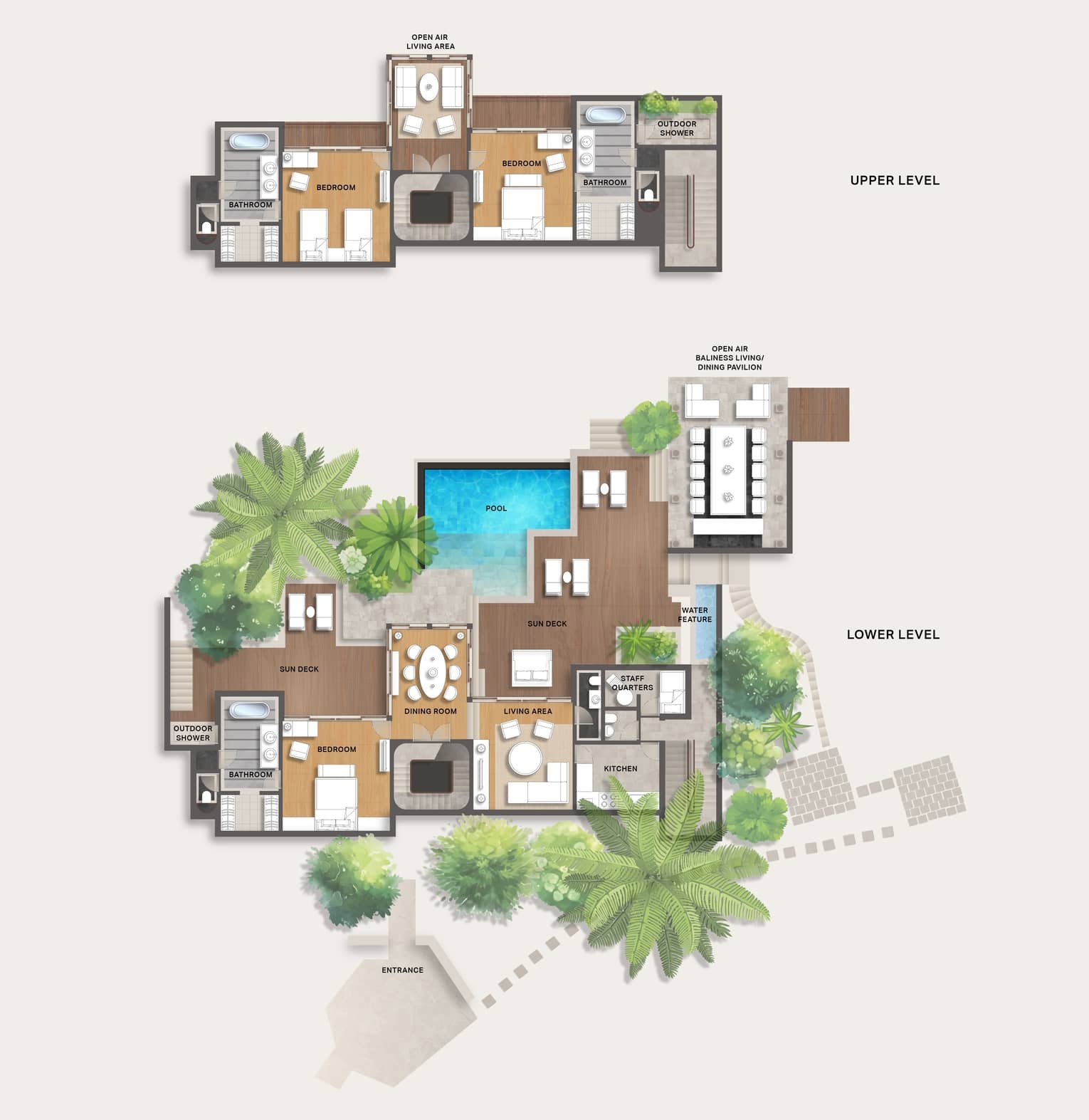 这栋以众多艺术品点缀的三卧皇家别墅可通过位于酒店华丽屋顶的入口进入,设有私人泳池、开放式起居和用餐区,呈现别具风情的巴厘岛风格,处处散发着闲适、优雅的气息。