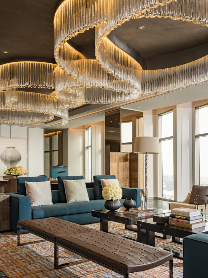 总统三卧室套房中引人注目的玻璃枝形吊灯仿佛悬挂在树叶上的晶莹冰柱,在超大起居室的天花板上蜿蜒交织。套房内设有一间办公室、一间媒体室、一间私人水疗室、一间设备齐全的美食厨房以及一张可供 10 人用餐的餐桌,全都以高规格住宅标准打造。宾客还可使用行政贵宾酒廊,让妙不可言的首尔贵宾居停体验更添格调。